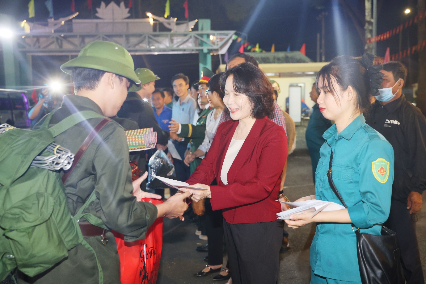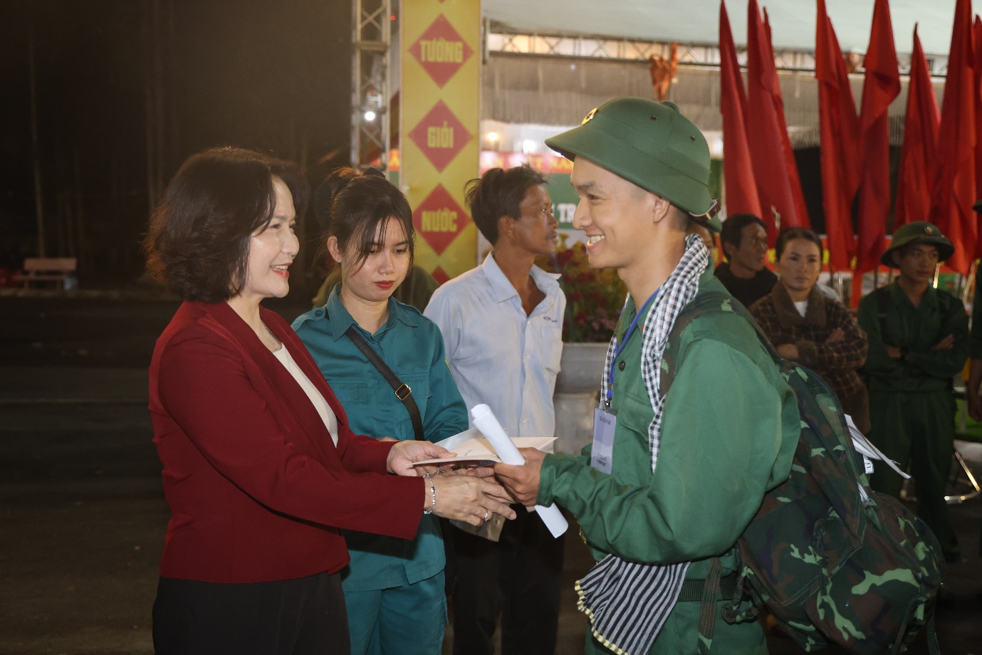 Đồng chí Nguyễn Thị Cát Tiên, Bí thư Đảng ủy, Chủ tịch Hội đồng nhân dân xã Xuân Lộc đeo vòng hoa và tặng quà các thanh niên trúng tuyển NVQS.