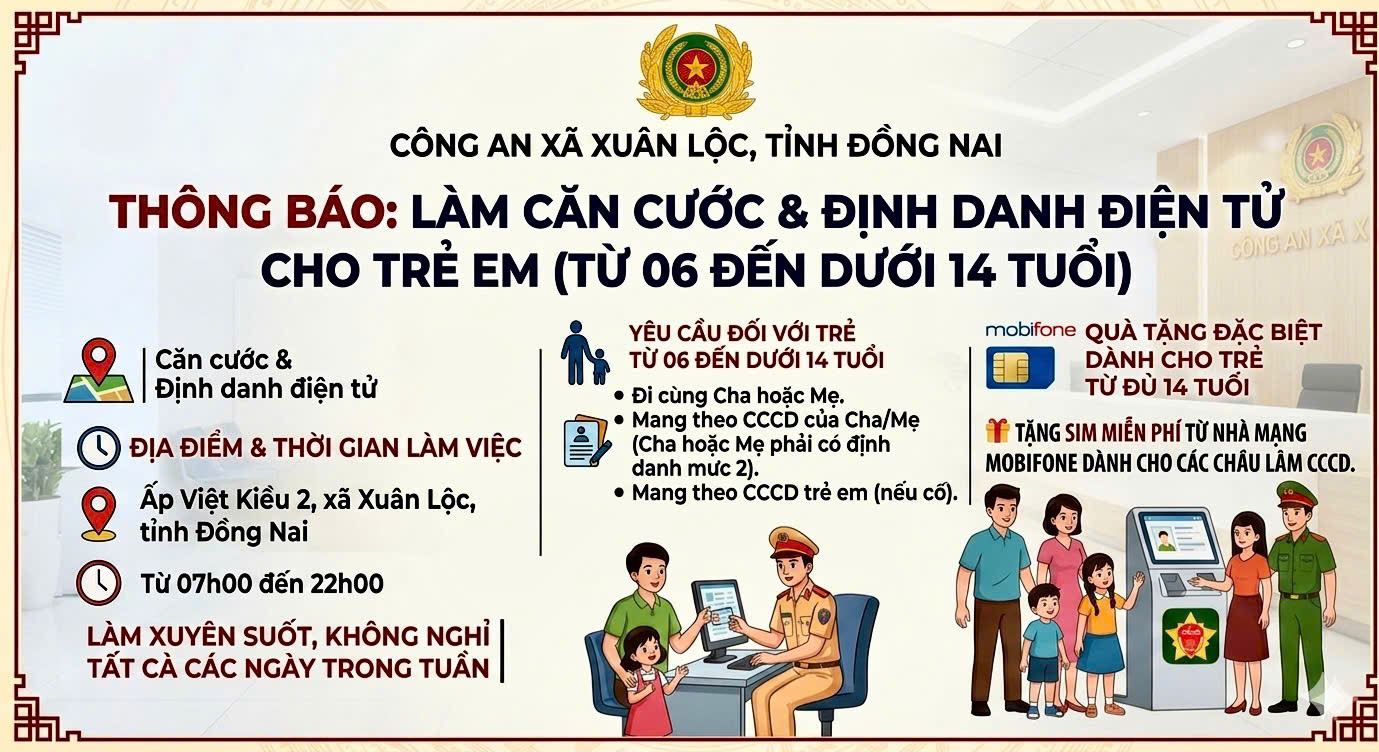 Theo đó, việc cấp căn cước và đăng ký định danh điện tử cho trẻ em từ đủ 06 đến dưới 14 tuổi trên địa bàn xã Xuân Lộc được thực hiện tại Bộ phận một cửa của Công an xã Xuân Lộc (Ấp Việt Kiều 2, xã Xuân Lộc, tỉnh Đồng Nai). Thời gian tiếp nhận hồ sơ từ 07h00 đến 22h00 hằng ngày, làm việc liên tục tất cả các ngày trong tuần.