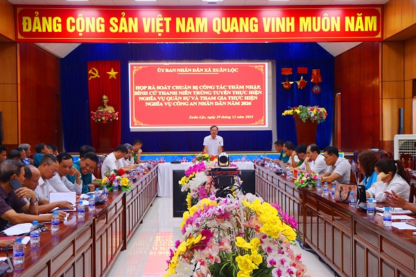 Chiều ngày 29/12, UBND xã Xuân Lộc tổ chức cuộc họp rà soát, chuẩn bị công tác thâm nhập, bình cử thanh niên trúng tuyển thực hiện nghĩa vụ quân sự (NVQS) và tham gia nghĩa vụ Công an nhân dân (CAND) năm 2026. Đồng chí Lê Khắc Sơn – Phó Bí thư Đảng ủy, Chủ tịch UBND xã, Chủ tịch Hội đồng Nghĩa vụ quân sự (HĐNVQS) xã chủ trì cuộc họp.