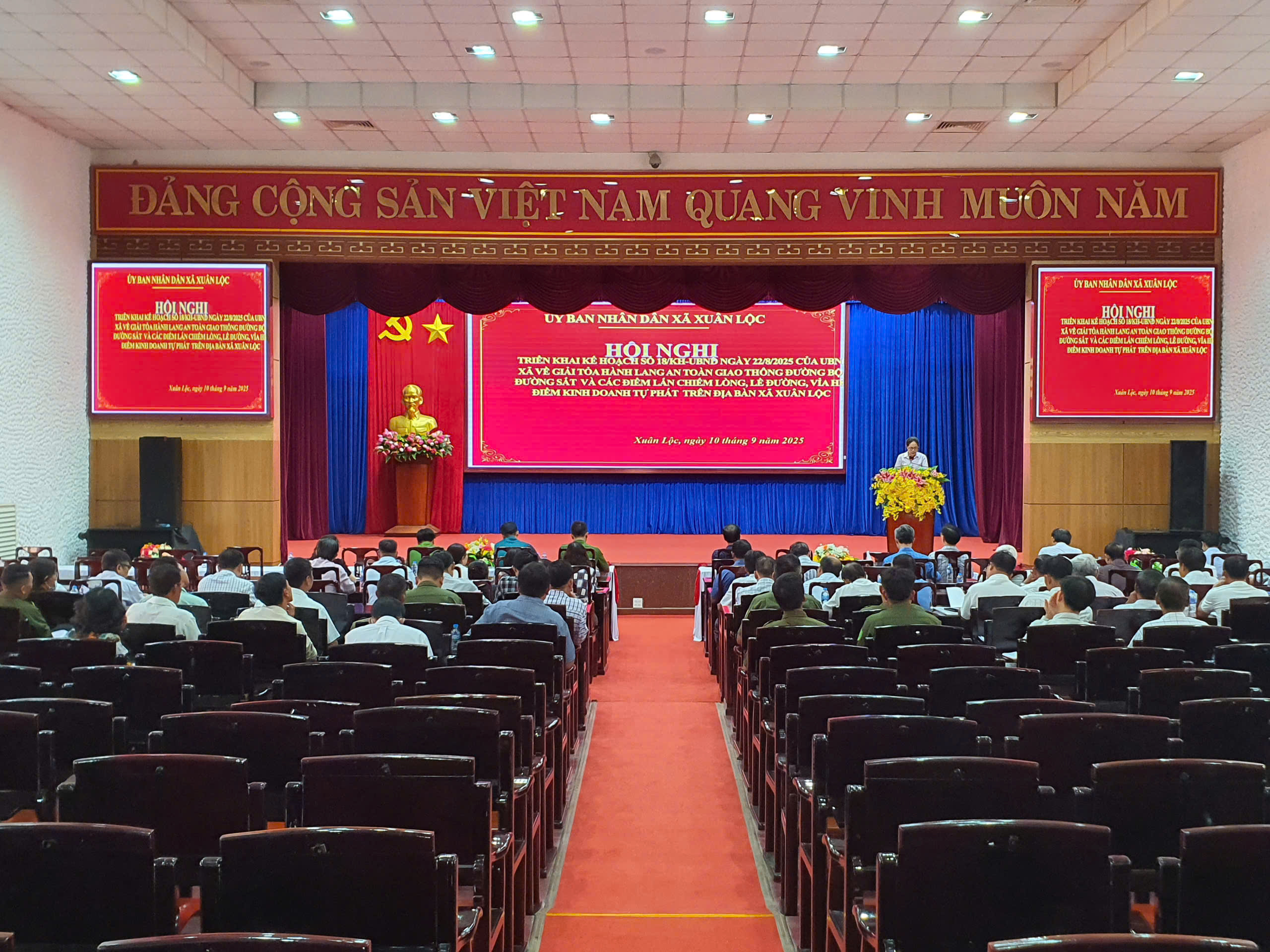 Chiều ngày 10 tháng 9, xã Xuân Lộc tổ chức hội nghị triển khai Kế hoạch số 18/KH-UBND ngày 22 tháng 8 năm 2025 của UBND xã về giải tỏa hành lang an toàn giao thông (HLATGT) đường bộ, đường sắt và các điểm lấn chiếm lòng, lề đường, vỉa hè, điểm kinh doanh tự phát trên địa bàn xã. Đồng chí Lê Khắc Sơn – Phó Bí thư Đảng ủy, Chủ tịch UBND xã dự chủ trì hội nghị.