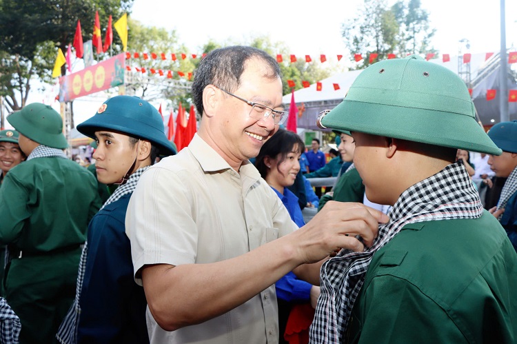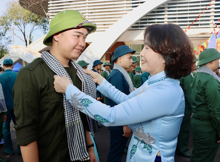 Lãnh đạo xã Xuân Lộc trao khăn rằn, động viên thanh niên lên đường nhập ngũ
