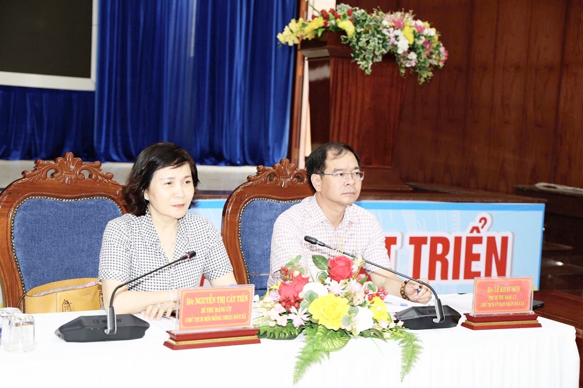 Đồng chí Nguyễn Thị Cát Tiên, Bí thư Đảng ủy, Chủ tịch Hội đồng Nhân dân xã. Đồng chí Lê Khắc Sơn, Chủ tịch UBND xã tham dự hội nghị trực tuyến