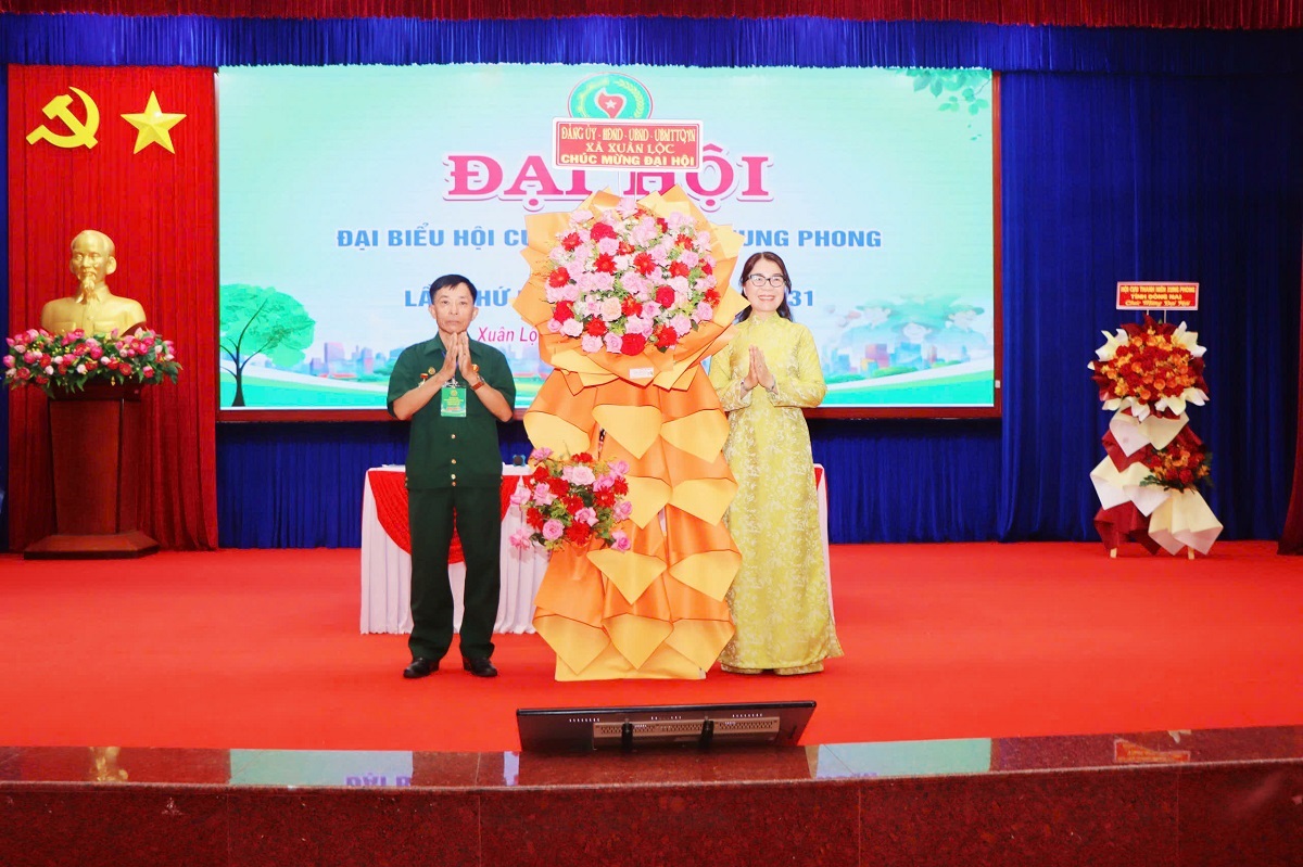Đồng chí Ngô Thị An, Phó Bí thư Thường trực Đảng ủy trao tặng lẵng hoa của Đảng ủy, HĐND, UBND, Ủy ban MTTQ Việt Nam xã Xuân Lộc chúc mừng Đại hội