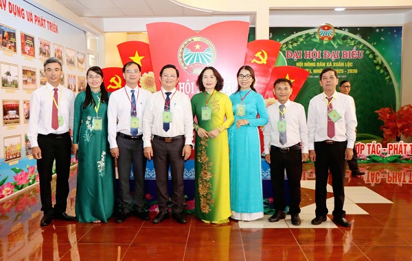 Các đồng chí trong Ban Chấp hành chụp hình lưu niệm cùng lãnh đạo Hội Nông dân tỉnh và lãnh đạo xã Xuân Lộc.