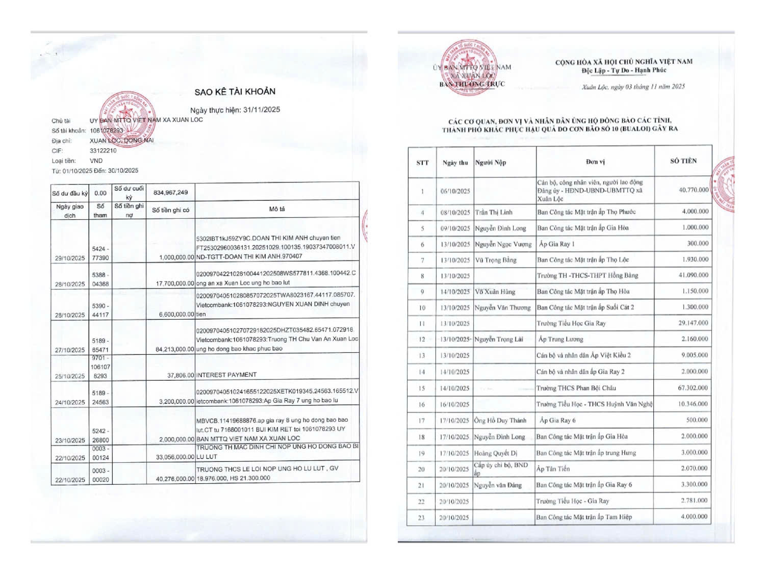 Ủy ban Mặt trận Tổ quốc Việt Nam xã Xuân Lộc vừa có báo cáo và công bố sao kê kết quả vận động ủng hộ đồng bào khắc phục hậu quả bão số 10.