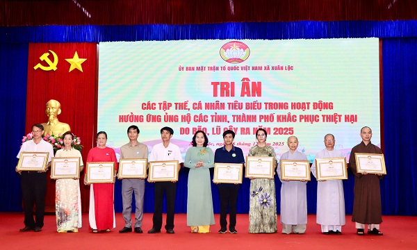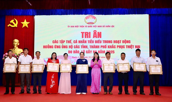 Dịp này, hội nghị đã công bố Quyết định và trao giấy khen của UBND xã đối với 30 tập thể và 30 cá nhân; giấy khen của Ban Thường trực Ủy ban MTTQ Việt Nam, Ban Thường vụ các tổ chức chính trị - xã hội xã đối với 16 tập thể và 30 cá nhân có thành tích xuất sắc trong hoạt động công tác Mặt trận, công tác đoàn thể trên địa bàn xã năm 2025. Đồng thời, 02 cá nhân có thành tích xuất sắc trong công tác Hội và phong trào phụ nữ năm 2025 được trao tặng Bằng khen của Hội Liên hiệp Phụ nữ tỉnh Đồng Nai.