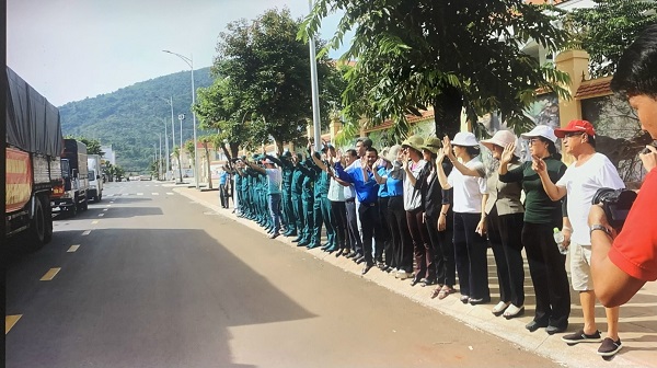 ​ Các đồng chí lãnh đạo xã Xuân Lộc và người dân tiễn đoàn xe lên đường mang hàng hóa đến các tỉnh miền Trung.