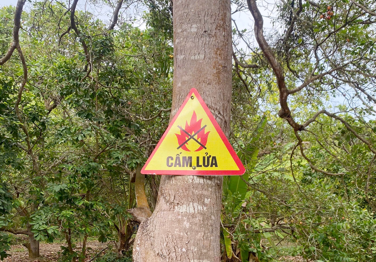 <figcaption>Nhân viên Trung tâm Văn hóa, Thông tin, Thể thao và Bảo tồn thiên nhiên núi Chứa Chan gắn biển cấm lửa trên núi Chứa Chan</figcaption>