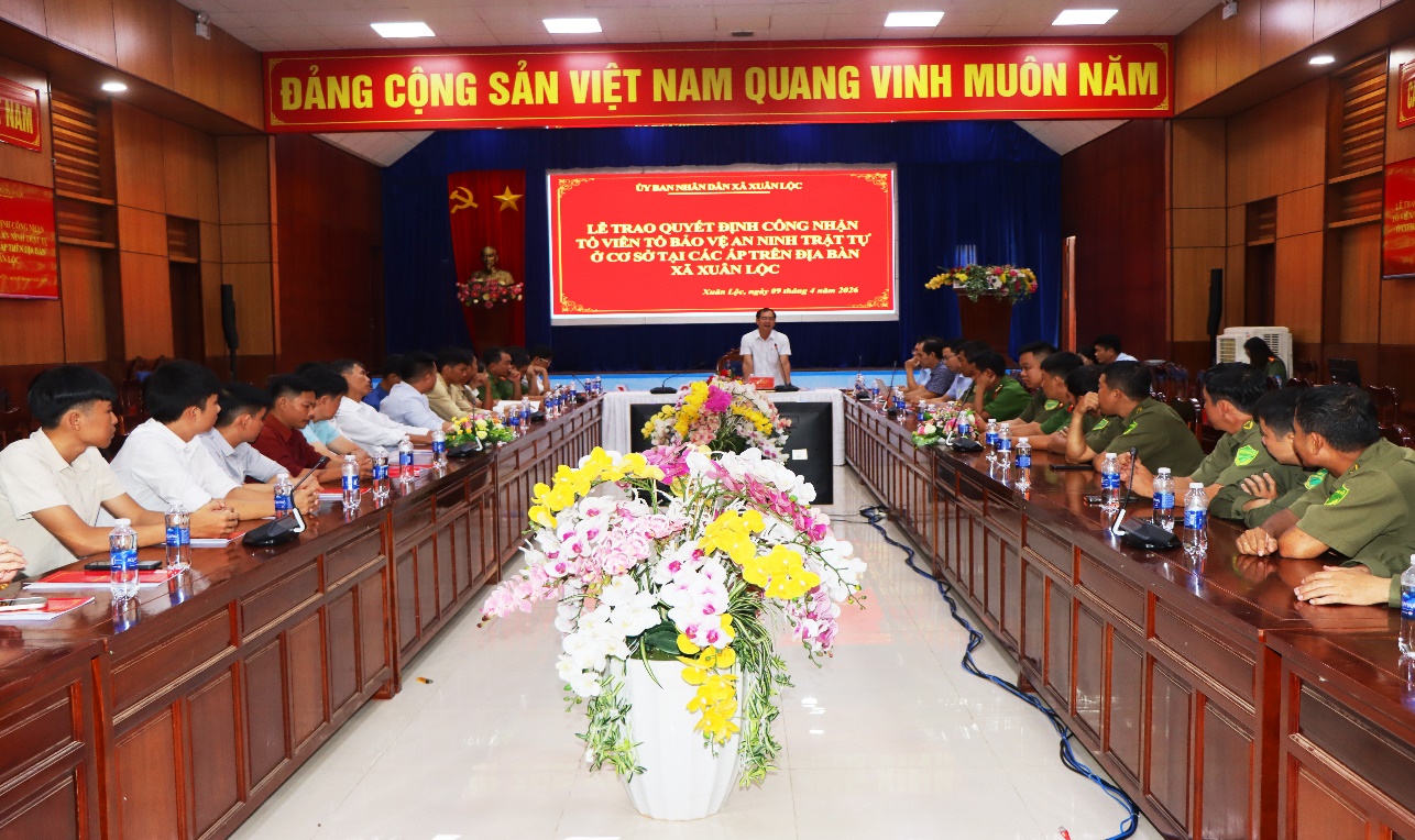 Chiều 9/4/2026, đồng chí Lê Khắc Sơn, Phó Bí thư Đảng ủy, Chủ tịch UBND xã Xuân Lộc chủ trì buổi lễ trao Quyết định công nhận Tổ viên Tổ bảo vệ an ninh, trật tự ở cơ sở.