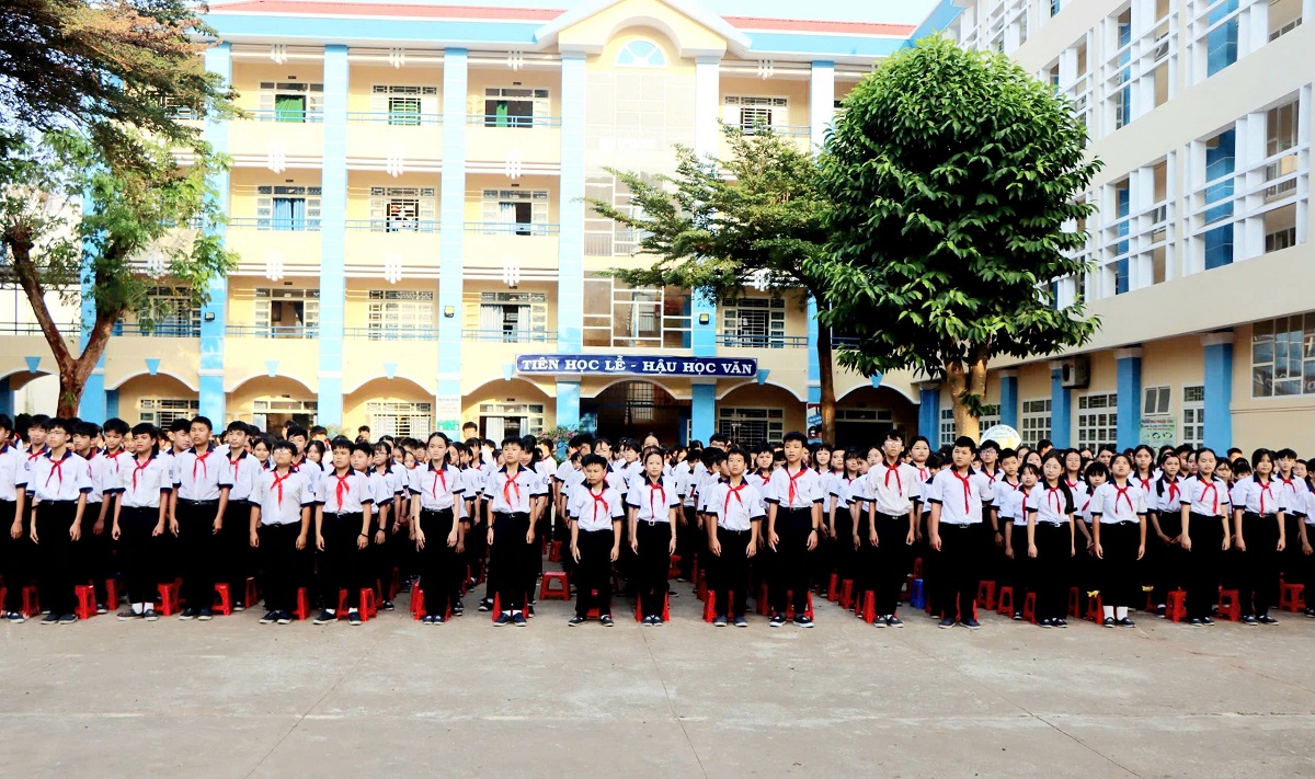 <figcaption>Đồng chí Lê Khắc Sơn, Phó Bí thư Đảng ủy, Chủ tịch UBND xã Xuân Lộc cùng Ban giám hiệu trường THCS Phan Bội Châu thực hiện nghi thức chào cờ</figcaption>