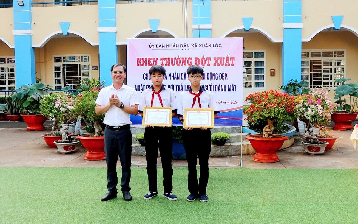 <meta property="og:title" content="Chủ tịch UBND xã Xuân Lộc khen thưởng học sinh nhặt được của rơi, trả lại cho người đánh mất">
