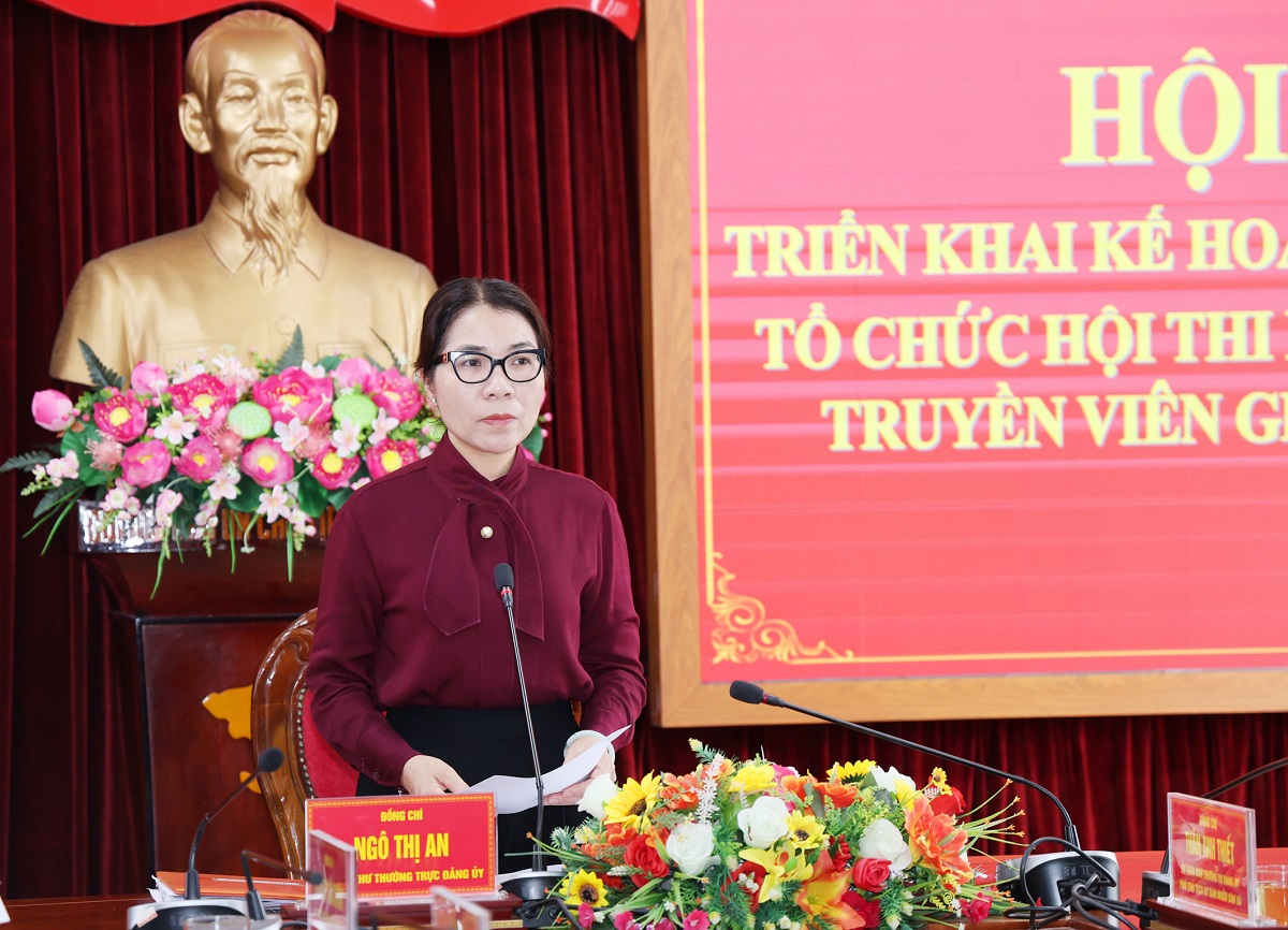 <span style="color:rgb(0, 0, 0);"><span style="font-size:16px;"><span style="font-family:Arial,Helvetica,sans-serif;">Phát biểu chỉ đạo tại buổi làm việc, đồng chí Ngô Thị An đề nghị Ban Tổ chức chuẩn bị chu đáo các điều kiện để hội thi diễn ra nghiêm túc, chất lượng, đúng mục đích, yêu cầu đề ra; đồng thời tăng cường công tác tuyên truyền, tạo sự lan tỏa sâu rộng trong cán bộ, Đảng viên và Nhân dân. Bên cạnh đó, cần chú trọng nội dung thi gắn với thực tiễn địa phương, bảo đảm tính thiết thực, dễ hiểu, dễ nhớ, góp phần nâng cao hiệu quả công tác tuyên truyền trong tình hình mới.</span></span></span></div>