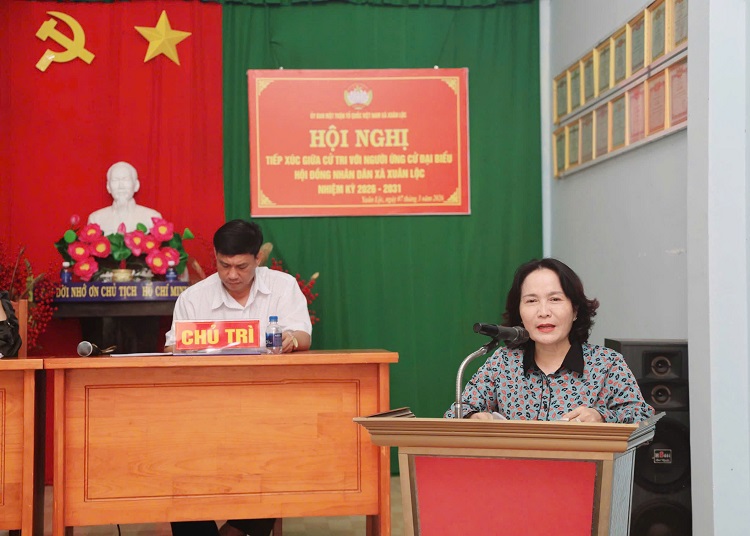 Ứng cử viên Nguyễn Thị Cát Tiên, Bí thư Đảng ủy, Chủ tịch HĐND xã Xuân Lộc trình bày chương trình hành động tại Hội nghị tiếp xúc cử tri