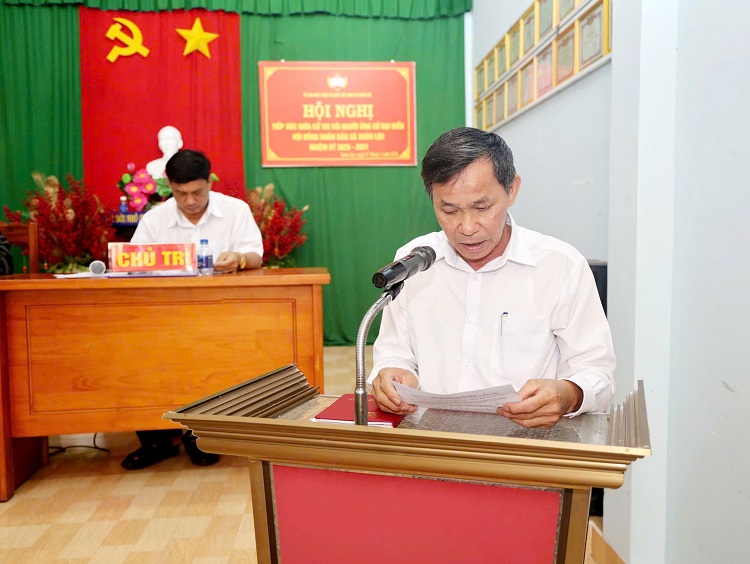 Ứng cử viên Lê Sanh, Ủy viênBan Chấp hành Đảng bộ xã, Phó Trưởng Ban Kinh tế - Ngân sách HĐND xã Xuân Lộc trình bày chương trình hành động tại Hội nghị tiếp xúc cử tri.