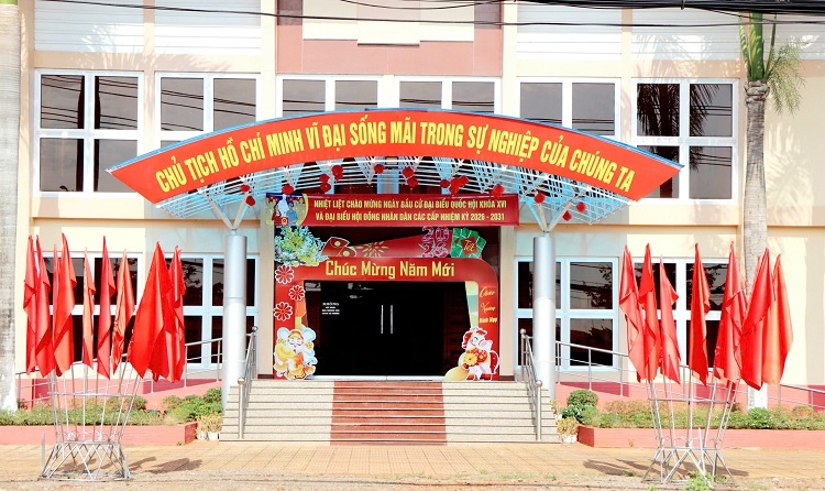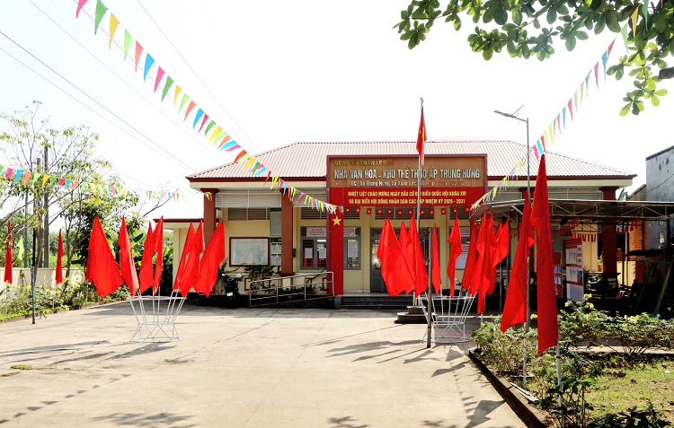 Phía trước Trung tâm hội nghị xã Xuân Lộc được trang hoàng nổi bật với sắc đỏ chủ đạo