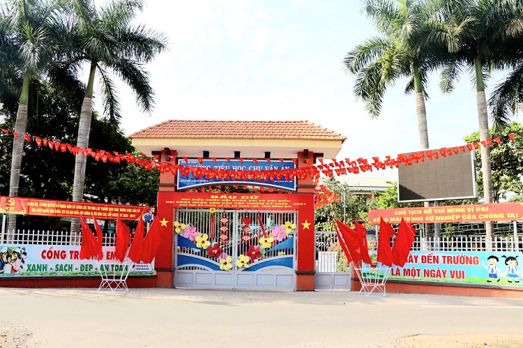 Quanh trường tiểu học Chu Văn An, biểu trưng về ngày bầu cử 15/3 cùng cờ Tổ quốc, cờ Đảng nổi bật với sắc đỏ chủ đạo