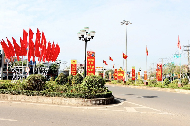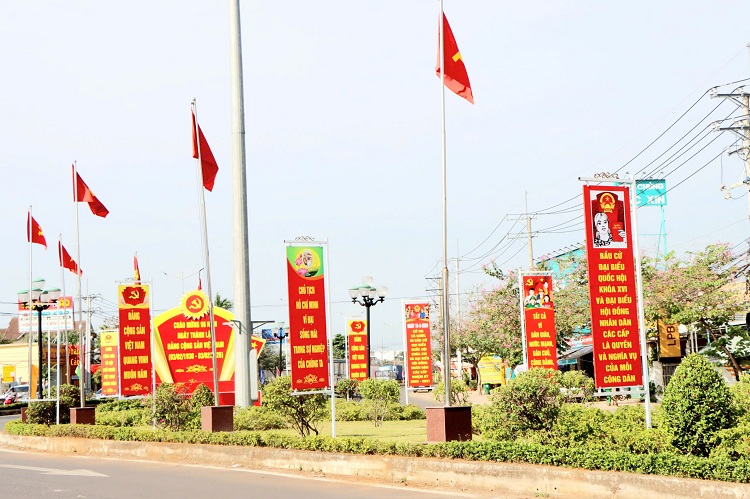 Tại các trục đường chính rực rỡ Cờ Tổ quốc, băng rôn, khẩu hiệu, pano, áp phích tuyên truyền