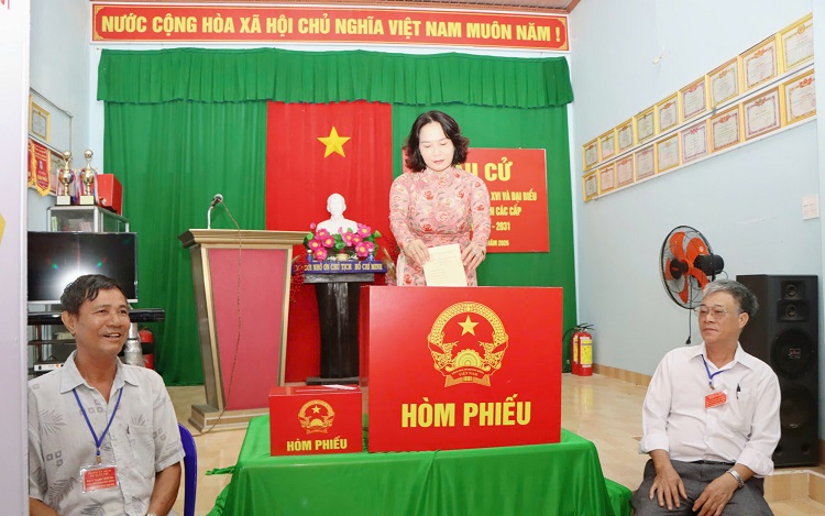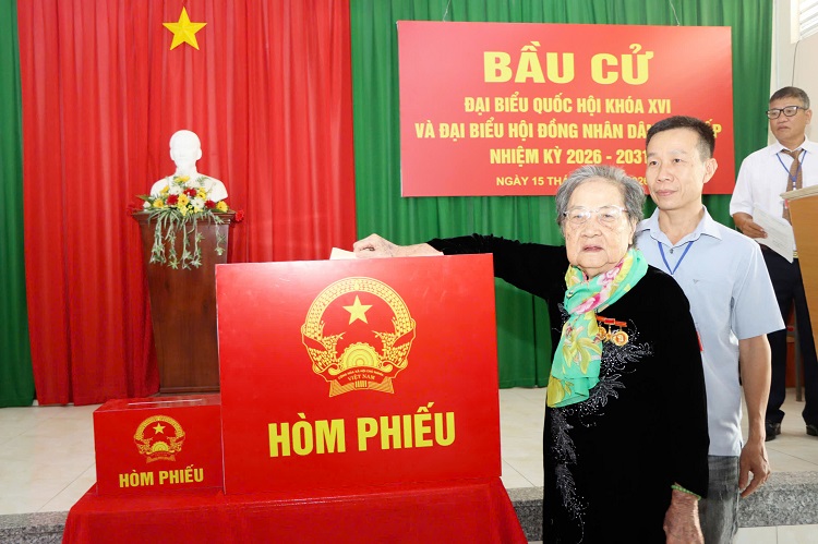 Mẹ Việt Nam anh hùng Trần Thị Kim Vệ tham dự lễ khai mạc và bỏ lá phiếu đầu tiên tại Khu vực bỏ phiếu số 1 (Nhà Văn hóa ấp Trung Hưng)
