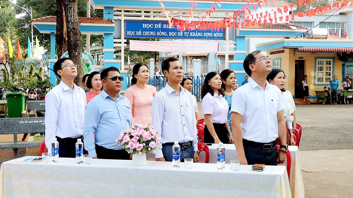 Đồng chí Lê Khắc Sơn, Phó Bí thư Đảng ủy, Chủ tịch UBND xã Xuân Lộc cùng Ban giám hiệu trường THCS Phan Bội Châu thực hiện nghi thức chào cờ