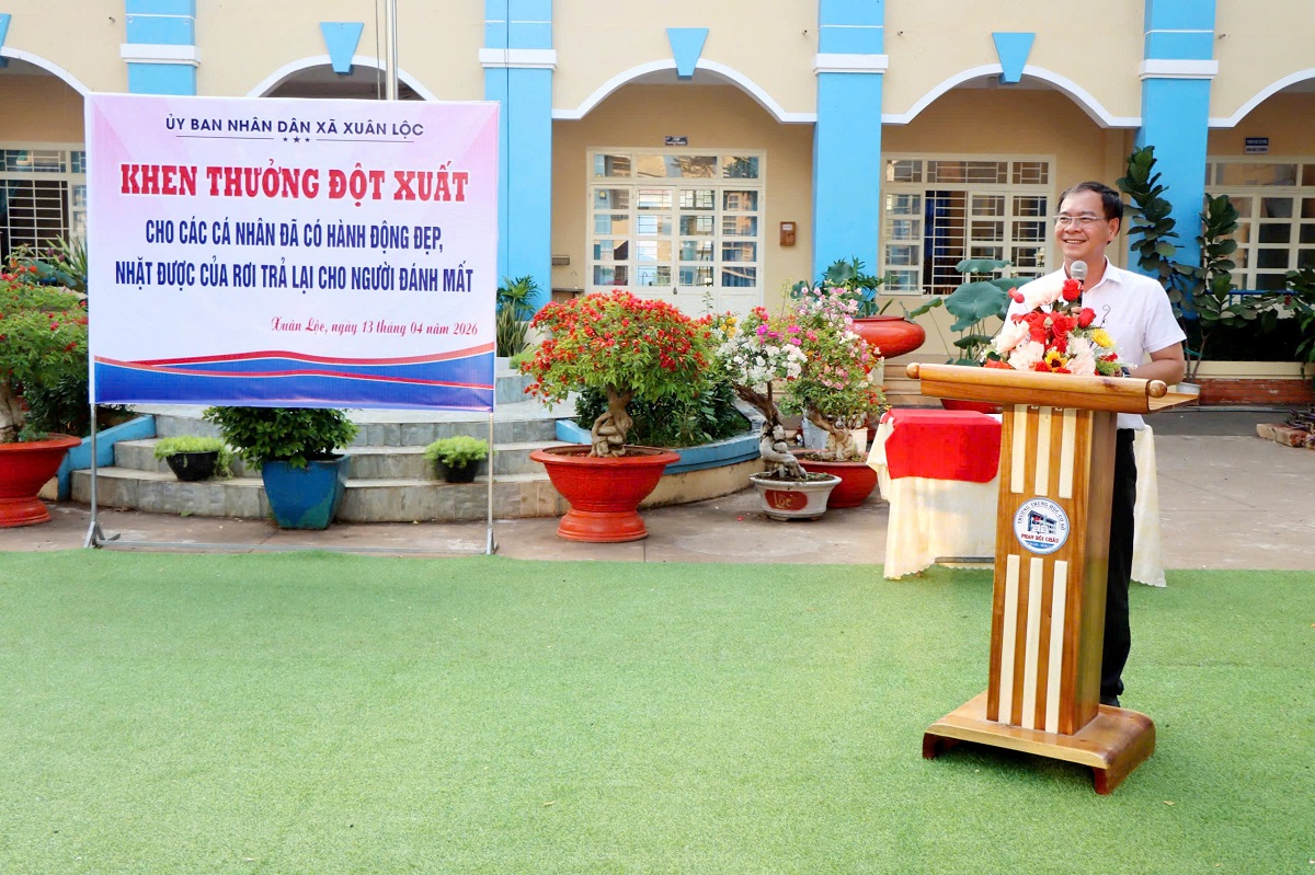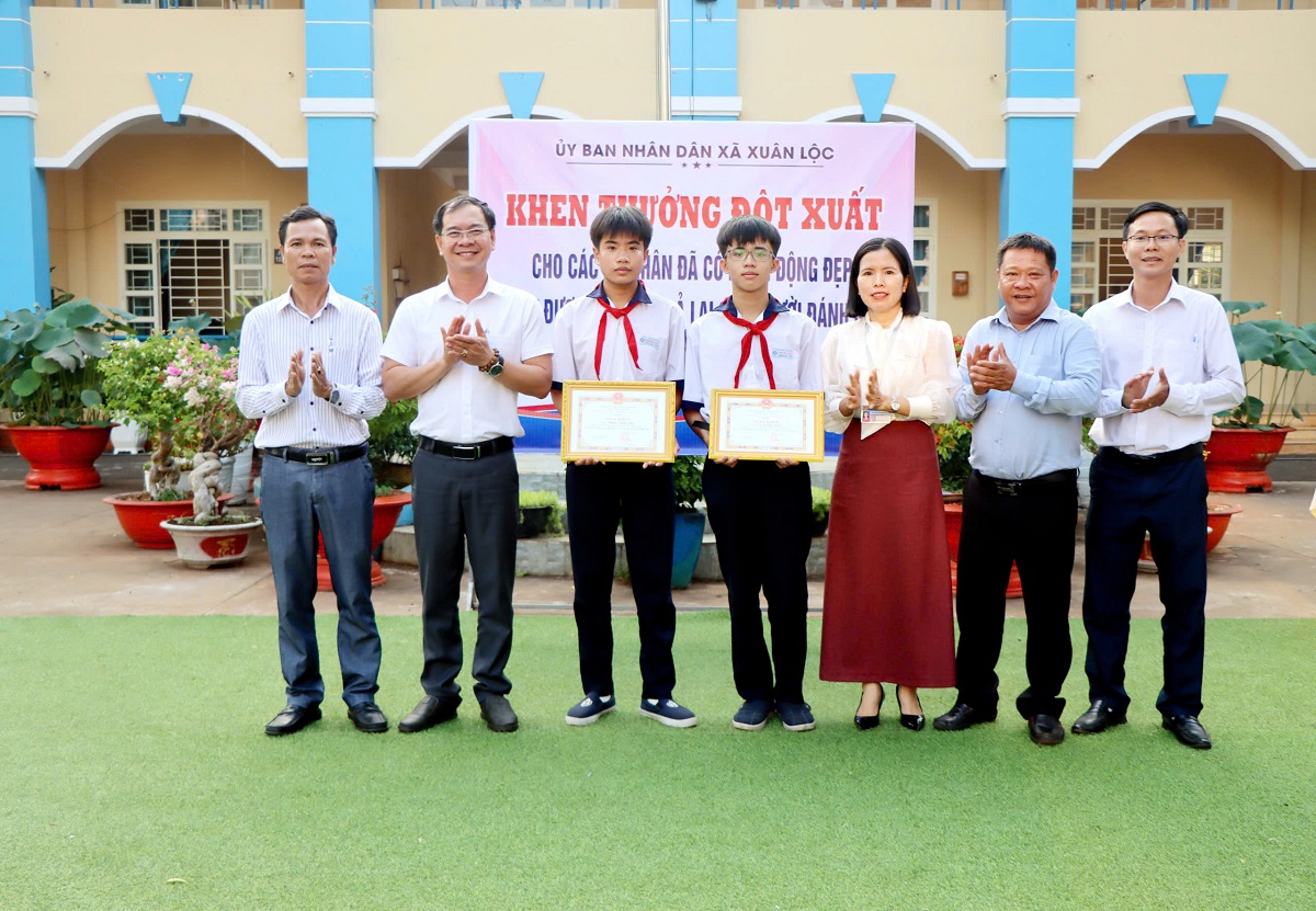 Tại buổi lễ, đồng chí Lê Khắc Sơn, Phó Bí thư Đảng ủy, Chủ tịch UBND xã Xuân Lộc đã trao khen thưởng và biểu dương tinh thần trung thực, nghĩa cử đẹp của hai em học sinh trường THCS Phan Bội Châu; đồng thời mong muốn thời gian tới những hành động đẹp tiếp tục được nhân rộng, lan tỏa, góp phần xây dựng xã hội ngày càng văn minh, tốt đẹp hơn. Đồng chí cũng đề nghị nhà trường và các em học sinh tiếp tục hun đúc, phát huy và lan tỏa những nghĩa cử đẹp này.