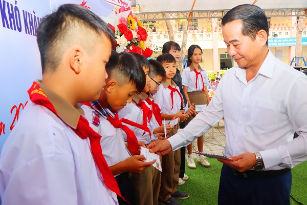 Phó Bí thư Tỉnh ủy, Trưởng ban Tổ chức Tỉnh ủy, Bí thư Đảng ủy các cơ quan Đảng tỉnh Đồng Nai Thái Bảo tặng học bổng cho các em học sinh