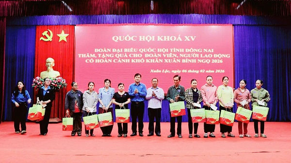 Nhân dịp Tết Nguyên đán Bính Ngọ 2026, chiều 06/02, tại Trung tâm Hội nghị xã Xuân Lộc, Đoàn đại biểu Quốc hội tỉnh Đồng Nai phối hợp Liên đoàn Lao động tỉnh tổ chức tặng quà Tết cho đoàn viên, người lao động có hoàn cảnh khó khăn trên địa bàn 2 xã: Xuân Lộc và Xuân Hòa.