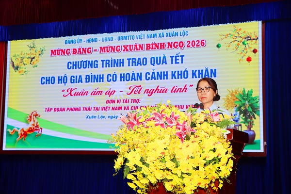 Phát biểu tại buổi lễ, Phó Bí thư Thường trực Đảng ủy Ngô Thị An đã gửi những lời chúc mừng tốt đẹp nhất đến với những hộ gia đình nhân dịp năm mới, đồng thời nhấn mạnh, bên cạnh hỗ trợ từ nguồn ngân sách, cấp uỷ, chính quyền và các tổ chức chính trị - xã hội xã Xuân Lộc còn vận động các mạnh thường quân, các Công ty, tổ chức, doanh nghiệp cùng chung tay hỗ trợ giúp đỡ những hộ còn nhiều khó khăn trên địa bàn xã, nhằm kịp thời động viên, chia sẻ và giúp các gia đình đón Tết cổ truyền của dân tộc đủ đầy, ý nghĩa hơn.