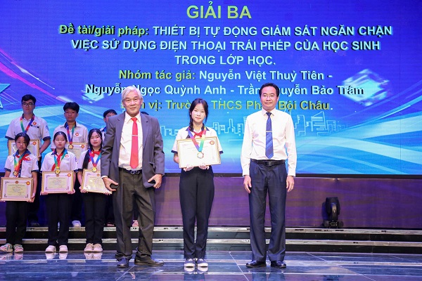 Giải Ba thứ hai thuộc về nhóm tác giả Thủy Tiên, Quỳnh Anh và Bảo Trâm với tác phẩm “Thiết bị tự động giám sát, ngăn chặn việc sử dụng điện thoại trái phép của học sinh”. Ý tưởng xuất phát từ thực tế việc học sinh sử dụng điện thoại trong giờ học gây ảnh hưởng đến tiếp thu kiến thức và hiệu quả giảng dạy. Thiết bị giúp giáo viên giám sát, đồng thời tự động cảnh báo khi phát hiện sử dụng điện thoại không đúng quy định, góp phần xây dựng môi trường học tập nghiêm túc, kỷ luật và an toàn. Sản phẩm được đánh giá cao về tính sáng tạo, khả năng ứng dụng và cách giải quyết vấn đề thực tiễn một cách khoa học.