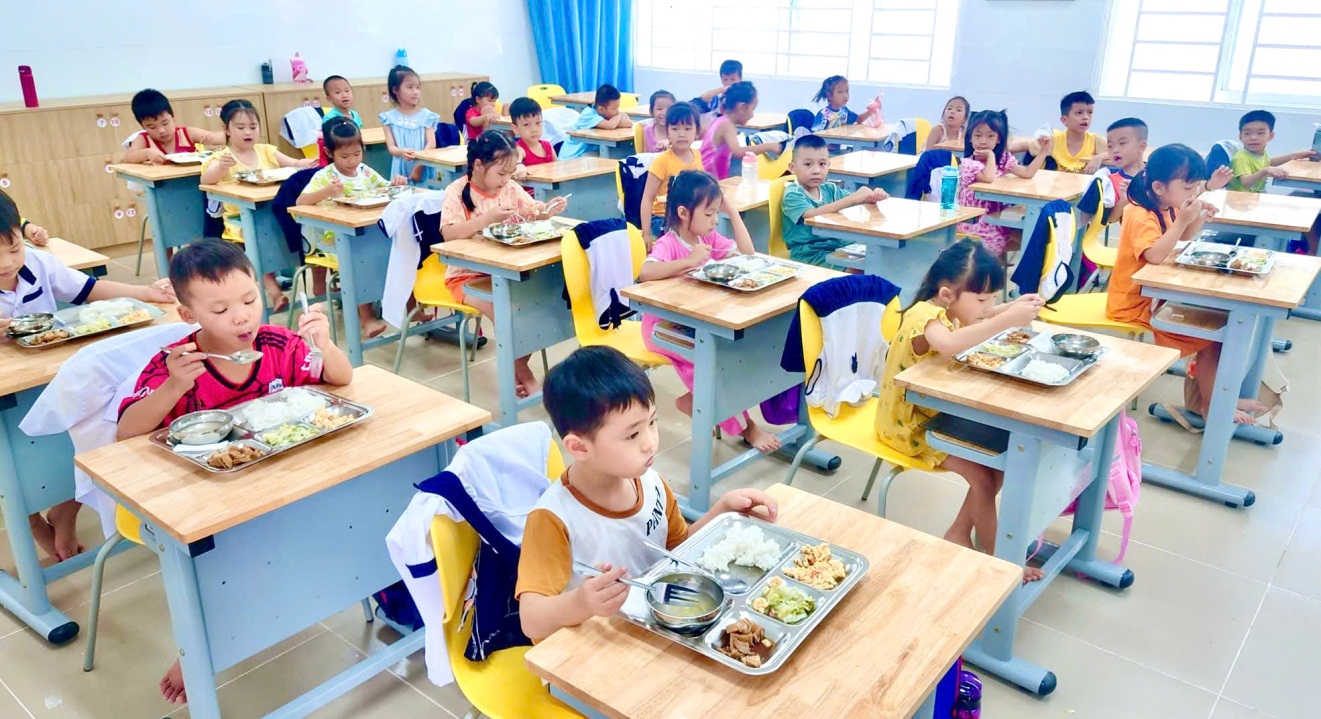 Buổi ăn trưa của các em học sinh bán trú tại trường tiểu học và trung học cơ sở Huỳnh Văn Nghệ