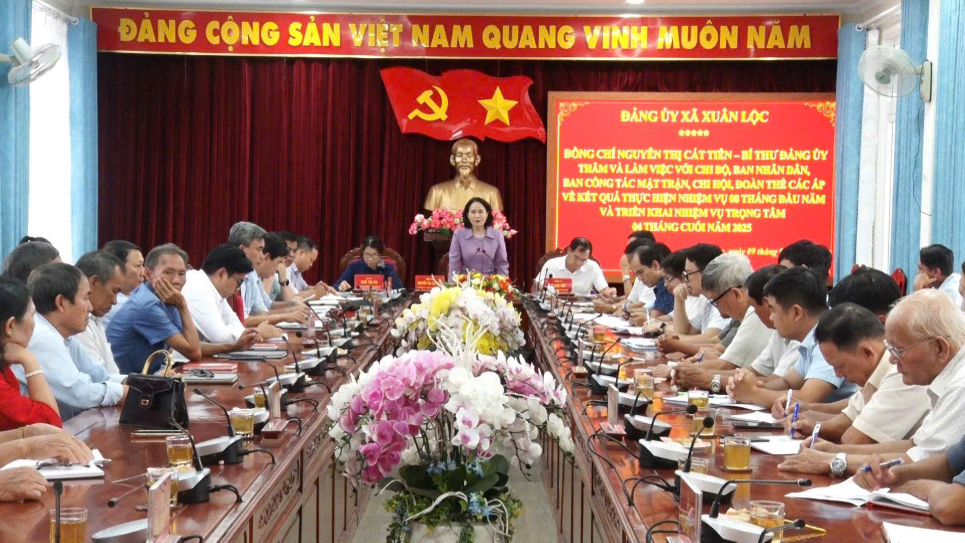 Chiều ngày 9/9, Đoàn công tác Đảng ủy xã Xuân Lộc do đồng chí Nguyễn Thị Cát Tiên – Bí thư Đảng ủy, Chủ tịch HĐND xã làm Trưởng đoàn đã có buổi làm việc với Chi bộ, Ban Nhân dân, Ban Công tác Mặt trận, chi hội và đoàn thể 8 ấp gồm: Gia Ray 1, Gia Ray 2, Gia Ray 3, Gia Ray 4, Gia Ray 5, Gia Ray 6, Gia Ray 7 và ấp Gia Ray 8 về kết quả thực hiện nhiệm vụ 8 tháng đầu năm 2025 và phương hướng nhiệm vụ 4 tháng cuối năm 2025. Cùng tham gia Đoàn công tác có đồng chí Ngô Thị An - Phó Bí thư Thường trực Đảng ủy; đồng chí Lê Khắc Sơn - Phó Bí thư Đảng ủy, Chủ tịch UBND xã; lãnh đạo HĐND, UBND, Ủy ban MTTQ Việt Nam xã và thủ trưởng các cơ quan, đơn vị.