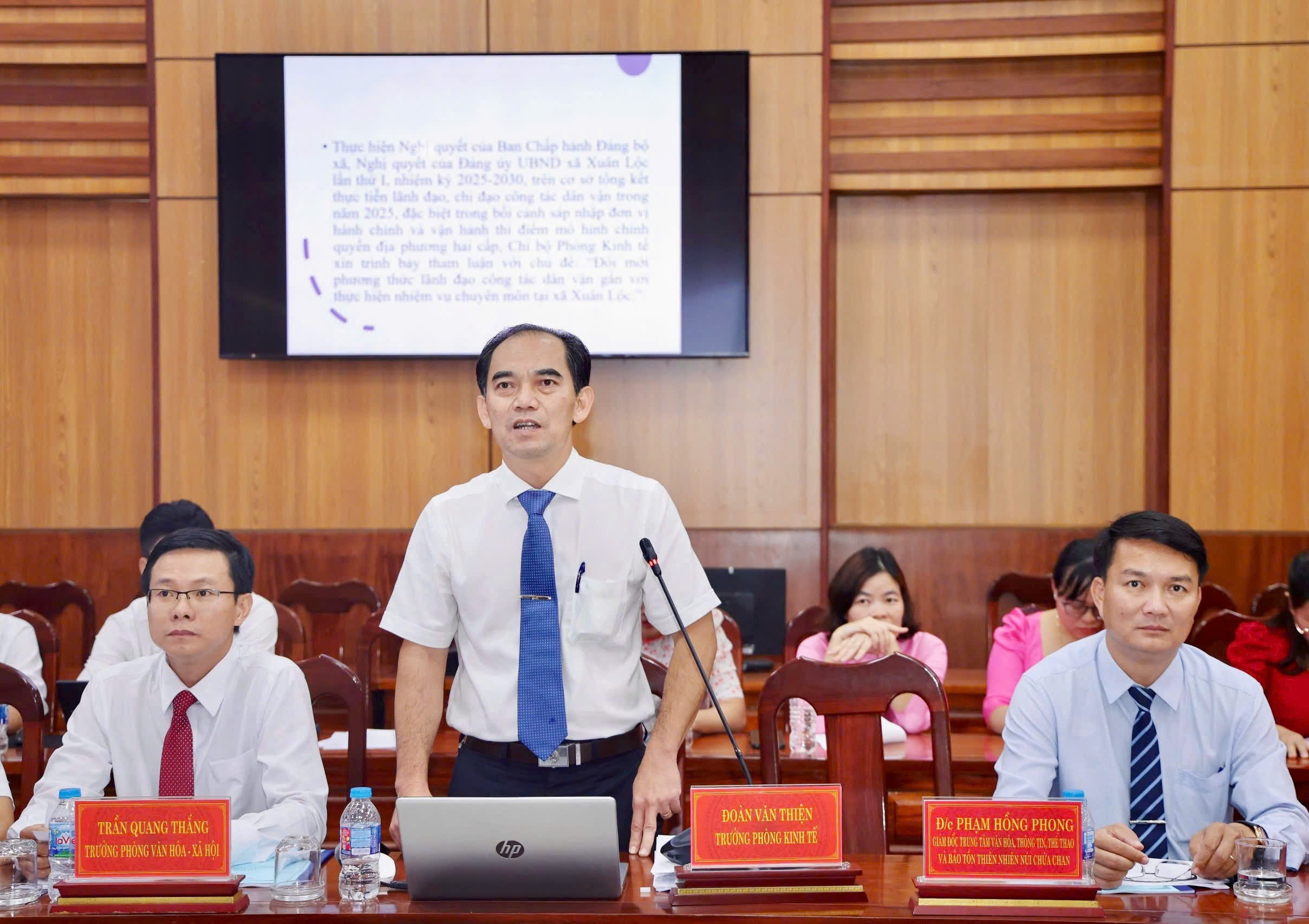 Đồng chí Đoàn Văn Thiện - Bí thư Chi bộ Phòng Kinh tế tham luận tại hội nghị