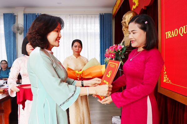 Đồng chí Nguyễn Thị Cát Tiên – Bí thư Đảng ủy, Chủ tịch HĐND xã trao quyết định cho đồng chí Trần Thị Kim Cương - Hiệu trưởng Trường Mầm non Xuân Thọ