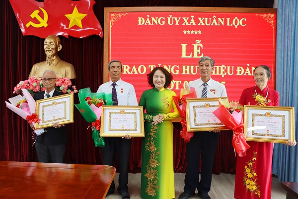 Đồng chí Nguyễn Thị Cát Tiên – Bí thư Đảng ủy, Chủ tịch HĐND xã Xuân Lộc trao Huy hiệu Đảng cho các đảng viên