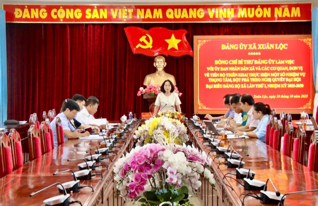 Sáng 28-10, Đảng uỷ xã Xuân Lộc tổ chức hội nghị rà soát, đánh giá tiến độ triển khai thực hiện một số nhiệm vụ trọng tâm, đột phá theo Nghị quyết Đại hội đại biểu Đảng bộ xã lần thứ I, nhiệm kỳ 2025-2030. Đồng chí Nguyễn Thị Cát Tiên, Bí thư Đảng uỷ, Chủ tịch HĐND xã chủ trì hội nghị.