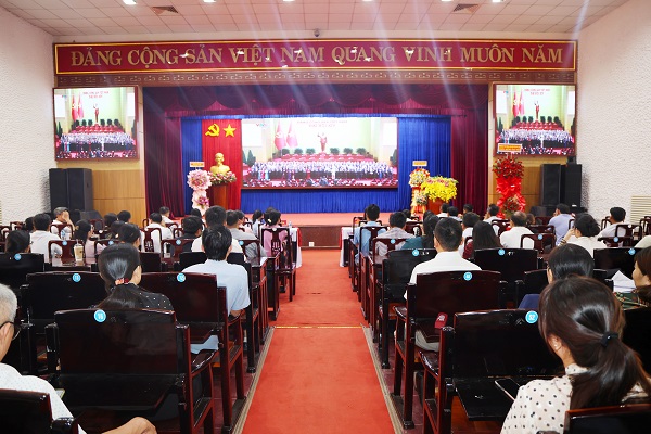 Quang cảnh buổi theo dõi phiên bế mạc Đại hội qua truyền hình trực tiếp tại điểm cầu Trung tâm Hội nghị xã